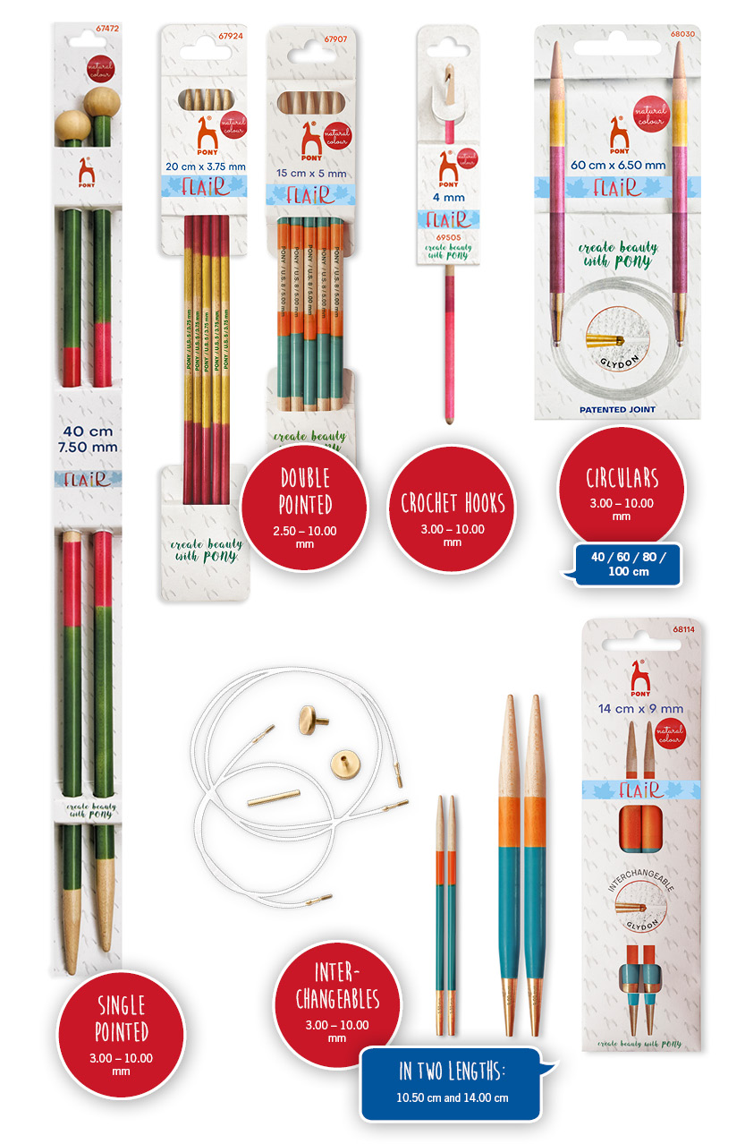 Enjoy the beauty and elegance of well-tempered colour combinations. A fine choice of warm natural colours characterizes these exquisite needles and gives you a faboulous knitting experience. Created with organic colours and hand applied individually, each PONY Flair needle is made to delight you.