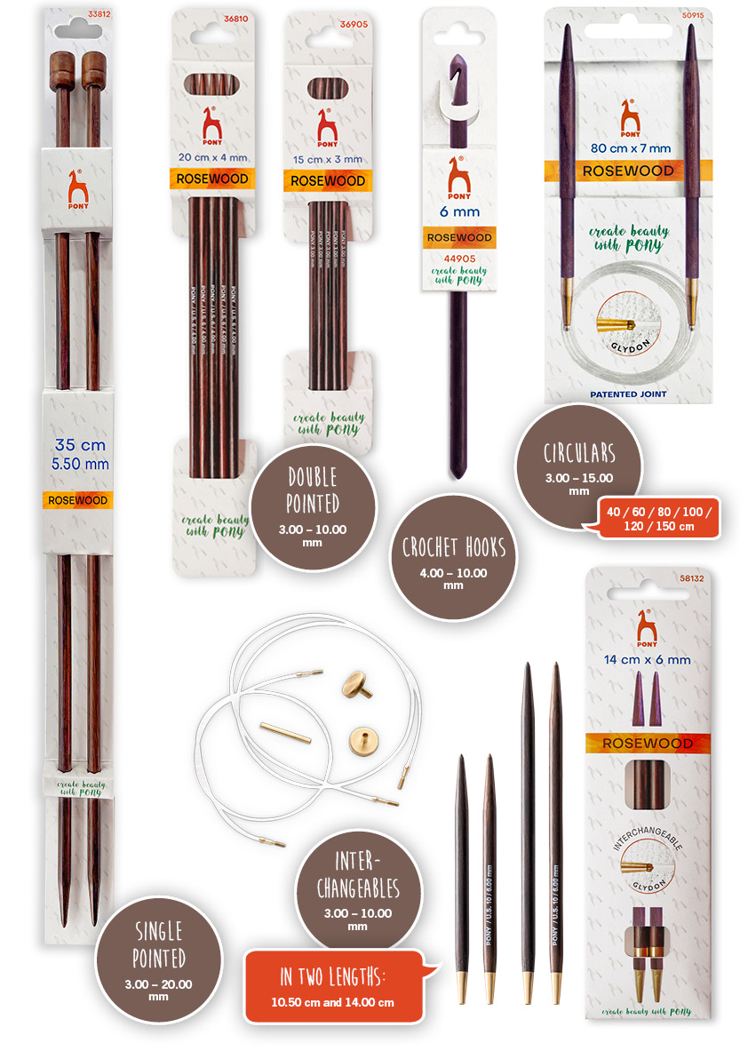 A distinguishing feature of PONY Rosewood circular needles is their superior patented GLYDON joint which is also available in PONY’s range of Interchangeable knitting pins. PONY’s high-precision screw thread mechanism made from top-quality solid brass connects the shank and cable with an easy twist to form a tight and smooth joint allowing the yarn to move easily and snag-free.